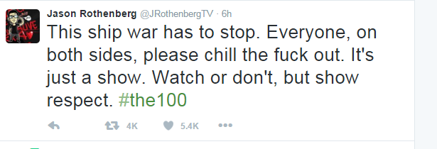 I read a tweet this morning that made me sad. It was from the Creator Executive Producer of The 100, Jason Rothenberg. Apparently, recent ship war activity for the show caused Rothenberg to voice his opinion.
