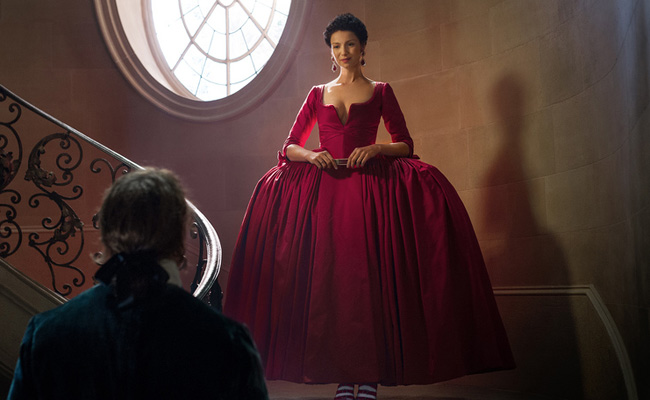 A couple weeks later Claire and Jaime are getting ready to leave for Court and this woman is wearing an incredible red dress. Very skimpy bodice. Jaime does not approve, but come on now, we all know Claire, she’s wearing it or she’s not going, simple as that, and we all know Jaime, whatever Claire wants, Claire gets, period.