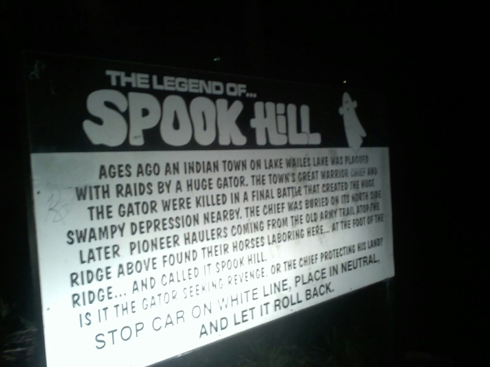 SPOOK HILL, I’ll go to Spook Hill!! Spook Hill is this place where something weird happens when you pull your car up to a line on the road and put it in neutral. Your car will start rolling backwards down the road. Now, you might say, No Way, the road is on a hill. Don’t let the name fool you one bit! The road is as flat as I’ve ever seen! No matter how many times you pull up to that line and put your car in neutral, as soon as you take your feet off the pedals, BAM your car starts rolling backwards a good 30-50 feet. I took two pictures of the sign that explains the history, one right after the other. Anyone notice the weird black line running down almost the middle of one picture but not the other……creepy!!