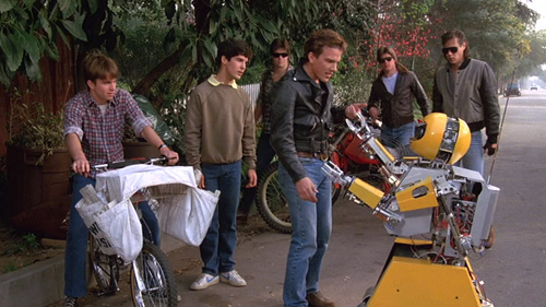 Paul and Tom teach BB how to be a newspaper delivery…robot. Along the route, they stop at the home of reclusive mean old biddy, Elvira, who’s not too happy with these boys or damn robot being on her property. Threatening them with a double-barreled shotgun, they leave. Walking away, they encounter 3 bikers led by Carl. Carl throws Paul in the trash and his best buddy BB grabs the jerk by the crotch. The bikers leave while swearing revenge.