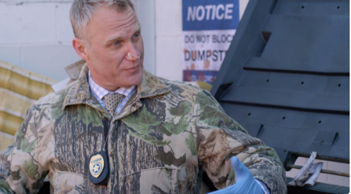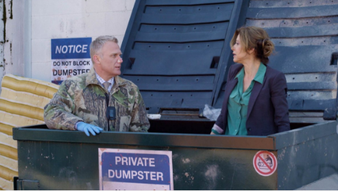 The criminal mastermind gives his workers the encoded gift cards for a job well done. Amanda and Mitch are able to catch the couple when theyuse the cards and tells them that they could be charged with a misdemeanor instead of a felony if they cooperate and give the name of the person behind the ring. The information leads the inspectors to a motel but unfortunately, the suspect has already checked out and paid with cash so there’s no way to track him down. Or is there? Amanda and Mitch decide to go dumpster diving to search for clues. It’s a dirty job, but Mitch is prepared because he has an extra outfit to wear over his suit.