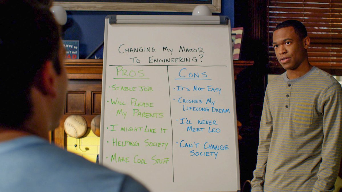 Noah tells Preston that he will need to take a load of hard college courses to graduate on time if he changes his major to Engineeing. Noah shows Preston the Pro/Con list he prepared that he plans to show to his parents. But he worries that pursuing his dream will hurt them.