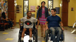 Meanwhile, Veronica (Erica Sanchez) is excited because it is the tenth anniversary of when she, Preston (Bret Green) and Noah (Harrison Knight) buried their time capsule and they will be digging it up. Noah is goofing off, jumping up and down on Preston’s bed when he takes a bad fall. He later tells Preston and Veronica that he will be confined to a wheelchair for four weeks. Preston offers to give Noah a crash course in Wheelchair 101 and tells Noah that now he will get to know what it’s like to “walk in another man’s shoes.”