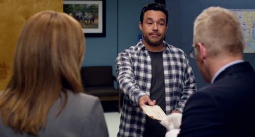 As the episode opens, Jose Garcia (Jim H. Miranda) of Garcia Construction is showing Mitch (Terry Serpico) and Amanda (Jessica Lundy) the letters he’s been receiving signed ‘QV’ and telling him what an awful person he is and that he deserves his mall project to fail. Amanda explains that unless the letters contain a direct threat under the First Amendment they’re not illegal and unfortunately, there’s nothing the postal inspectors can do. But later when Garcia brings another letter to them that is obviously threatening, Amanda asks him for permission to monitor his mail. Garcia tells them that his company has a P.O. Box in town. Mitch and Amanda begin going through the mail for the construction company and Mitch finds a padded parcel containing a suspicious powdery substance. Amanda tells Mitch she’ll contact the dangerous substance unit and everyone is cleared out of the postal facility.