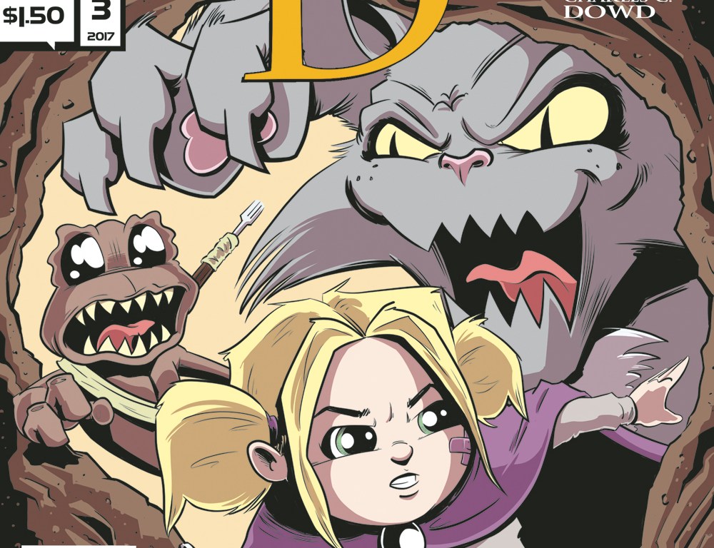 In the adorable third issue of Lilith Dark the beasties have decided that Lilith and anyone connected to her would be better off as possibly meatloaf, at least that’s what she thinks. As she and her sister try and find a way to escape her brother and beloved sidekick, Snowball the dog, have made their way into the tree. As the humans and canine try and figure out a plan, Lilith’s new sidekick, Spoon, is trying his best to fight against his own beastly brethren. As our team begins to see that they might just have to work together, Lilith finds herself battling a brand new monster and receiving some aid from an unexpected extinct source.