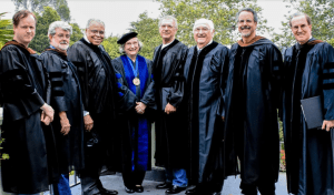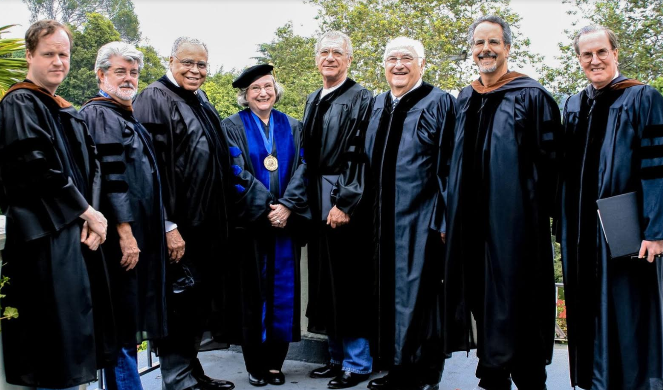 Presenters and honorary degree recipients at the 2006 AFI Commencement ceremony (left to right): Josh Whedon, George Lucas, James Earl Jones, Jeanine Basinger, Sidney Pollock, Chuck Fries, Jon Avnet, and John F. Cooke.