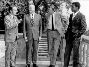 AFI founding chairs and leaders on the terrace at Greystone in 1969 (left to right): founding director and CEO George Stevens Jr., founding chair of the National Council on the Arts