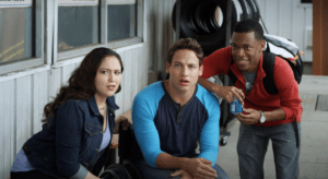 But once on the road, Noah has been driving for longer that his mobile app indicated. What good is a short cut if it takes longer than the normal route? And to make matters worse, Noah’s car breaks down! The trio are able to make it to Dave’s Garage in Summerville, West Virginia. While Noah is trying to get a soda from the vending machine, several guys come out of the garage restroom. Preston and Veronica recognize one of them as Nate Irvin (James Hal Hardy), lead singer for 21 Monkeys. What are the odds of 21 Monkeys not only using the same app as Noah, but their tour van breaking down and they being at the same garage as Noah, Preston and Veronica? This gives Preston the chance to ask the band if 21 Monkey will play The Henry Wainwright Foundation benefit. Preston gives Nate Irvin a flyer and explains that the proceeds from The Henry Wainwright Foundation benefit go to texting while driving awareness. Nate is interested, but needs to ask his agent first. After Preston tells him it’s crucial he gets an answer now, Nate Irvin says 21 Monkeys will play the benefit. And as 21 Monkeys van is fixed but the garage needs a part which they won’t be able to get until the next day so the gang will miss the show, Nate gives Noah, Preston and Veronica a preview right there at Dave’s Garage.