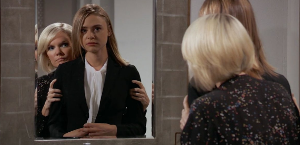 Carly (Laura Wright) was so happy to be back home. It didn’t even bother her when she had to spend the night in lockup. As hers and Jason’s (Steve Burton) cells were near each other, Carly told Sonny (Steve Burton) that they talked all night. When Mike (Max Gail) entered from the patio, Carly and Sonny first thought he didn’t recognize her. But soon he told a caregiver that the man was off the clock because he (Mike) wanted to spend time with his daughter-in-law. Mike then asked Carly where she was keeping herself, his Alzheimer’s causing him to forget about her stint in Ferncliff. Curtis (Donnell Turner) asked Jordan (Vinessa Antoine) to meet him at The Metro Court. Despite her busy case load, Jordan took the time to spend the evening in bed with Curtis. Franco (Roger Hogwarth) tried to warn Alexis (Nancy Grahan) about Kiki (Hayley Erin) and Griffin (Matt Cohen) sleeping together but doesn’t have a chance before the trial begins. In her opening statement, Alexis talked about Dr. Bensch’s (James DePaiva) being a respected physician but also a sexual predator while all Scott (Kin Shriner) said was that his client was innocent. Elizabeth (Rebecca Herbst) testified about the shadow program and when Kiki was upset about getting a bad performance review and admitting Dr. Bensch was harassing her, Epiphany (Sonya Eddy) testified about scheduling Kiki’s rotation with Dr. Bensch, Francesca (Celesta DeAstis) testified about sleeping with Dr.Bensch because she was scared of losing her career, and Ava (Maura West) talked about when Bensch came to her art gallery and warned her that Kiki was risking her career because of burn out. Carly and Sonny took Mike to General Hospital when he fell town. Later, Mike told Stella (Vernee Watson) that he wasn’t the same Mike. Jordan confronted Stella when she (Jordan) saw a missed call from Chandra on Curtis’ cell phone. Franco pulled Griffin (Matt Cohen) aside and hinted that he knew Dr. Munro’s secret. Kiki testified about the photo of she and Griffin hugging when Scott questioned her about it. When Alexis called Griffin to the stand to elaborate on the nature of the photo, Scott frantically texted Franco to tell her to stop the questioning. Unfortunately, Ava had texted Franco at the same time to ask What’s going on? so Franco replied back with the text meant for Alexis to Ava with the message Kiki and Griffin Had Sex!