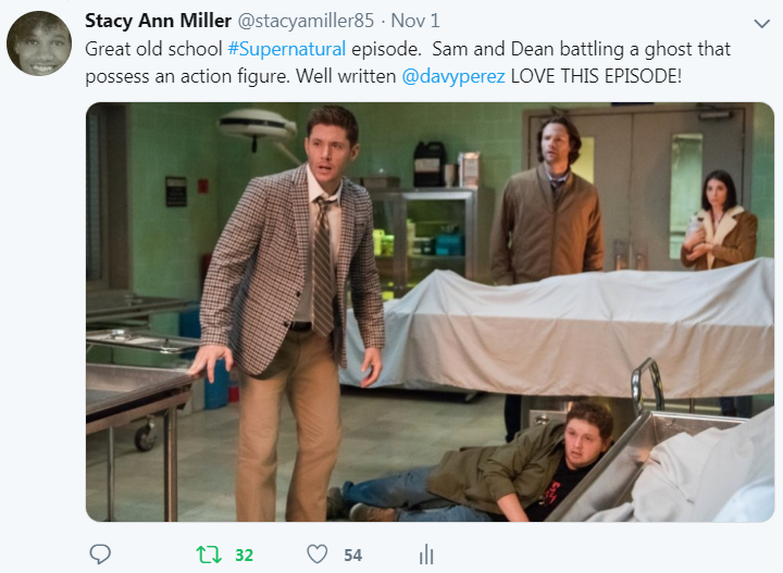 Actress Genevieve Buechner returned to Supernatural for another guest starring appearance. She previously played Lily Shoemaker in Season One Episode 5 “Bloody Mary,” which ironically re-aired on TNT on the day before “Mint Condition” on October 31 as part of the Supernatural Halloween Marathon and again on November 8 as Season One episodes are repeating on TNT. Buechner’s Samantha wasn’t like most of the women guest characters (First off, she didn’t get killed!). She kept her cool throughout the unbelievable situation of a ghost possessing an action figure. She had great chemistry with Sam (No, not romantic chemistry which doesn’t have to be the only type of chemistry on a show to enjoy) and wasn’t helpless. Sam and Dean are heroes and “saving people, hunting things” is part of the family business, but it’s great when every so often the person they try to protect is capable of saving herself. Genevieve Buechner did a great job. And third time’s the charm, here’s to her return for another Supernatural episode.