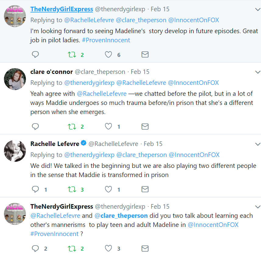 The casting of the Young Madeline and Young Levi were spot on. Physically, Clare O’ Connor looks like she could be a younger version of Lefevre’s Madeline. As I tweeted the Pilot via The Nerdy Girl Express, I was curious as to whether O’ Connor and Lefevre studied each other’s mannerisms in order to add to their performances of past and present day Madeline. I found the replies back to the inquiry from Clare and Rachelle interesting: