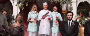 Next up is director Joe Dante’s “Mirari.” The set up finds Anna (Zarah Mahler) and David (Mark Grossman) coming into the theater not to watch the movie but because they can’t keep their hands off each other. But on screen, Anna sees herself in the movie. She has a scarred face which causes her to question whether she’s beautiful enough to marry her handsome fiancé. No problem, he loves her and says he’ll pay for her to get plastic surgery. That’s when I would have called off the wedding. He should have soothed her by assuring of his love, not by agreeing to change her looks. The plastic surgeon is Dr. Kildare himself, Richard Chamberlain. In “Mirari,” he’s Dr. Leneer. Let’s just say Anna’s surgery doesn’t turn out quite as she expected. She comes out from under the knife looking far worse than when she went in. The botched surgery was done on purpose for a malevolent motive.
