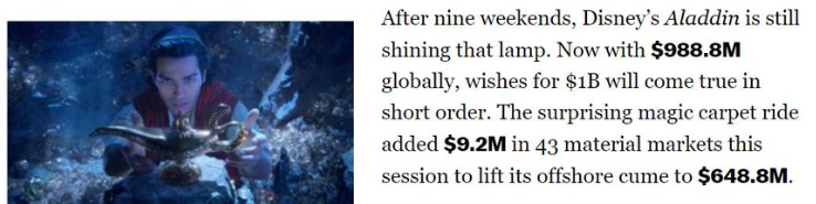 The cinematic scope of the production made Aladdin 2019 epic. Disney’s Aladdin has already grossed $921.7 million, tripling its $183 million budget. Like Aladdin’s magic carpet, this film is soaring and free wheeling through an endless diamond sky of movie success.
