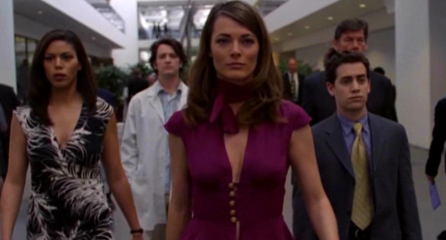 The Champions have entered the building. Team Angel won the battle against Wolfram and Hart and they ended world peace (“No we didn’t. Not like you’re implying”-Fred). Their prize? Wolfram and Hart (“Just the LA branch”- Lilah). Although suspicious of the law firm’s motive, Angel, Wesley, Gunn, Fred and Lorne took the guided tour of Wolfram and Hart. Angel was ready to decline taking over the firm until he saw a news report: Connor had snapped and taken hostages at a sporting goods store in the mall. Finding his crazed and despondent son had strapped explosives to not only the people in the mall but also himself and Cordelia, Angel realized he had to do whatever was necessary to make things right for his son. And he did…Connor’s memories and every one’s memories of him were erased to give him a fresh start. The father will kill the son prophecy was realized: Angel killed the old Connor to give birth to a new and improved version.