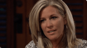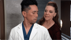 Carly (Laura Wright) told Jax (Ingo Rademacher) she fell down the stairs and broke her foot, which will take six weeks to heal. She met Gladys Corbin, who winked to Carly “I’m the grandmother” to Mike’s (Max Gail) confusion. Carly texted Sonny (Maurice Benard) to let him know Cousin Gladys was at The Metro Court. Sonny was pleased when Olivia (Lisa LoCicero) confirmed Julian (William deVry) was leaving town and she was buying Charlie’s. Julian came to General Hospital looking for Kim (Tamar Braun). Elizabeth told him the last time she spoke with Kim she got the impression Dr. Nero was starting to fall for her husband (Franco) even though she knew he wasn’t Drew but only had Drew’s memories. Franco/Drew (Roger Howarth) told Kim all he knew was being in the navy but in the body he was in now he’s probably too old to re-enlist so when he left Port Charles, he didn’t know what he would do. But before he left, “Drew” wanted her to tell him more about their son. Curtis told Jordan (Briana Henry) about being recommended by Hayden (Rebecca Herbst) for a new job. Jax told Hayden that Curtis turned out to be a moll hired by Valentin (James Patrick Stuart) to gather information on him (Jax). So later when Ashford came after to Elizabeth’s house to talk with Hayden, Jax expressed his doubts in trusting Curtis. But Curtis assured he was no longer working for Valentin. Trina (Sydney Mikalya) told Cameron (William Lipton) she wanted to get Dev (Ashton Arhab). Later at The Metro Court, Dev met his “nana” Gladys. Sonny warned Gladys against trying to renegotiate their arrangement. Josslyn (Eden McCoy) made her dad a cake for Australian Father’s Day. It turned out better than a previous attempt at baking a cake, that one didn’t even rise. Curtis and Jordan found Andre (Anthony Montgomery) badly injured at GH but Drew (Billy Miller) hadn’t been with him. Kim told Franco/Drew more stories about Oscar, admitting she had regrets for not telling Drew he had a son. Then, they shared a kiss.