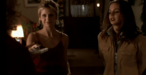 Meanwhile, Buffy and Joyce (Kristine Sutherland) are getting ready for a Summers Christmas. It’s hard finding the perfect tree; Buffy notices there’s a group of dead ones at the tree lot. Joyce doesn’t want anyone alone on Christmas and suggests Buffy invite Faith (Eliza Dushku). At first Faith declines saying she has other plans (not true). But then changes her mind and shows up. It’s obvious Faith is envious of the life Buffy has, which despite being The Slayer includes a loving mother and friends.