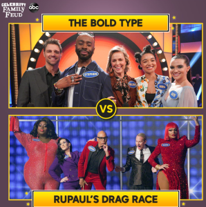 Season 6 Episode 3 is titled “The Bold Type vs. Rupaul’s Drag Race” Here is the synopsis: “The cast of Freeform’s critically acclaimed dramedy “The Bold Type” takes on RuPaul, the world’s most famous drag queen, and the team from his Emmy Award©-winning show, “RuPaul’s Drag Race,” in a fiercely funny faceoff for the ages in this new one-hour episode of ABC’s “Celebrity Family Feud.”