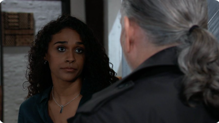 Curtis (Donnell Turner) and Jordan (Briana Henry) returned home and speculated on who this Grey person was. Cyrus (Jeff Kober) arrived at their place. He wanted Jordan to return to work soon. Maxie (Kristen Storms) and Peter (Wes Ramsey) welcomed Finn (Michael Easton) home from the hospital when he entered with Anna (Finola Hughes). Maxie asked about Alex’s (also Hughes) interest in her and her baby. Anna commented how Alex wasn’t always bad and had once saved her life. She also wondered what Alex meant when she said she and Peter were alike. Carly (Laura Wright) talked with Brando (Johnny Wactor) about Dev’s (Ashton Arbab) service. Trina (Sydney Mikayla) and Josslyn (Eden McCoy) went through Dev’s things. Joss gave Brando a bracelet Dev wore. Cameron came to visit Franco in his hospital room. After Elizabeth (Rebecca Herbst) left the room, Franco admitted he’s scared about his tumor. Martin (Michael E. Knight) returned the will Franco had drafted when he thought he was Drew to Elizabeth as it was technically the property of Franco Baldwin. Curtis asked Portia (Brook Kerr) to get him medical records from forty years ago. “Sam needs to know Julian almost killed her son” Sonny (Maurice Benard) told Jason. Sam (Kelly Monaco) continued to struggle with the dangers her children faced being in Sonny’s world. Carly overheard Josslyn told Sam sometimes she wished her life was normal. Carly asked Sam to not talk with Josslyn but come to her as someone who’s been through the same thing. At Renault’s request, Brando arranged a meeting between Cyrus and Sonny. Brando put on Dev’s bracelet. Curtis and Jordan ran into Martin and made the connection of his last name to their mysterious patient named Grey. Cyrus told Sonny that Julian was responsible for The Floating Rib bombing.