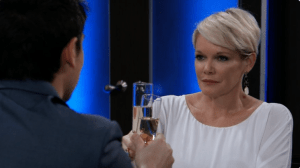 Alexis (Nancy Grahan) came to see Sam (Kelly Monaco), assured she hadn’t been drinking and asked her daughter for a second chance. Ms. Davis as long as she wasn’t around her grandchildren why should it matter if she drank. At the Quartermaine mansion, Tracy (Jane Elliott) commented about Ned (Wally Kurth) being away when she returned. Monica (Leslie Charleson) told Tracy that Ned cheated on Olivia (Lisa LoCicero) with Alexis. Tracy blamed Monica for not looking after the family in her absence, adding Alexis was a loose canon “Drunk lips sink ships” said Tracy. She left to do damage control. At the WSB Facility in Geneva, Franco (Roger Howath) and Scott (Kin Shriner) were told by the receptionist that Dr. Kirk was booked until March so Franco couldn’t see him. Meanwhile, Dr. Kirk reminded Dante (Dominic Zamprogna) that Peter August (Wes Ramsey) was a dangerous man. Dante runs into Anna (Finola Hughes) in GH’s hospital stairway. She asks him to go for coffee at The Bistro. Once there, they talk about Lulu (Emme Rylan). Dante regrets leaving his family for treatment for his PTSD. Liesl (Kathlee Gati) asked Dr. Kirk to see Franco, commenting Baldwin wouldn’t have come so far if it weren’t important. Sam told Elizabeth (Rebecca Herbst) what happened with Jason (Steve Burton) and her fear for her children’s safety. Convinced by Maxie (Kristen Storms) a double wedding was what Anna wanted, Finn (Michael Easton) agreed to share his and Anna’s ceremony with Maxie and Peter. He later told Anna about it but refused to take the blame because she never gave him the heads up. Liesl listened outside the door while Dr. Kirk refused Franco’s scans and medical records and they talked about the memory transfer. Tracy walked into The Metro Court dining room in time to hear Alexis tell Olivia to worry about her marriage after she had Ms. Davis cut off at the bar. The receptionist made Scott leave because she didn’t want him unattended when she went home for the day. But Baldwin doubled back and caught Liesl accessing the facility’s computer to find out what was wrong with Franco.