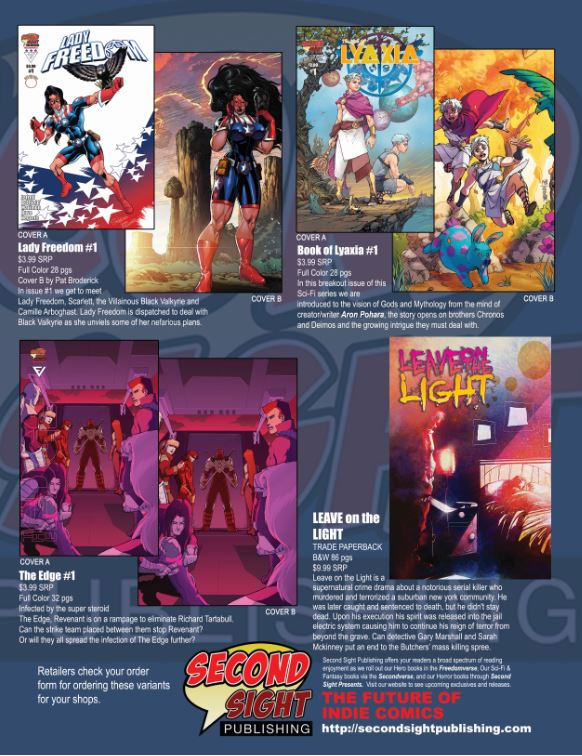 Second Sight Publishing reached out to me for some promotional coverage for the new year. They have four comics releasing that I had the chance to check out a bit early. I’ll be sharing some info and my thoughts on Lady Freedom, The Edge, Book of Lyaxia, and Leave on the Light. The image used in this header is their Diamond Comics ad, which shows all four. These comics are in previews, but will be available in March 2021. It is also important to note that the first three listed are single issues while the last in the list is a full trade paperback.