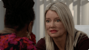 Jordan (Briana Henry) told Curtis (Donnell Turner) she made an appointment with Dr. Massey so they can work out their problems in therapy. Portia (Brooke Kerr) watched a conversation between Britt (Kelly Thiebauld) and Cyrus (Jeff Kober). Phyllis returned from Port Charles. Mike/Sonny (Maurice Benard) told he remembered someone. “I know what you both did to my daughter” Nina (Cynthia Watros) shouted to Jax (Ingo Radmacher) and Carly (Laura Wright). Curtis reminded Jordan they couldn’t be honest with Dr. Massey in therapy because of the legal compromises they both made. Curtis invited both Britt and Portia to a GH board meeting. Mike/Sonny told Phyllis he couldn’t make out the face of the woman he saw in his dream. Once everyone but Diane (Carolyn Hennessey) and Jason (Steve Burton) were there, Nina said she knew Jax and Carly were there when she died. At the board meeting, Cyrus asked for a vote of unanimous consent when he presented his pain medication to the FDA. Leslie entered and objected to Renault’s pain medication approval. Nina demanded Carly admit she could have saved Nelle (Chloe Lanier) but chose not to. Carly said despite her feelings for Nelle she tried to save her but was too late. Carly added what a horrible person Nelle was, reminding how she slashed Brook Lynn’s throat. Nina angrily said Carly didn’t have the right to decide who lived or died. She called Jax, Diane and Jason white knights coming to Carly’s rescue. And Carly said she remembered that side of Nina…the one who lashed out when she was hurt. She and Nelle weren’t too different after all. Before leaving, Nina called Jax a liar who did it with a tan and a smile. At the GH board meeting, Britt stated the medical information was outside her area of expertise with Portia adding Mr. Renault’s criminal background made it suspect. So, she blocked his unanimous vote. No matter, Cyrus reminded there would be a table vote next week. Curtis suggested he and Jordan separate so they have a chance to be alone to think about what they wanted. Britt texted Jason. Diane angrily reminded that as the family attorney she had to be the first to know things in order to do legal damage control. So, Jax and Carly came clean about what happened the night Nelle fell off the cliff. Jason got Britt’s text and had to leave. Mike/Sonny took away a drunk customer’s car keys. When Curtis came to the hospital, Portia said they needed to talk. Britt told Jason about the board meeting for Cyrus’ pain drug and the board vote in a week. Leslie came to see Monica (Leslie Charleson) asking her former rival’s help in proving Cyrus Renault for the snake he is. Realizing she was no longer a part of Jason’s world, Sam told Dante (Dominic Zamprogna) she was now just Sam. They drank a toast to the new Sam McCall. Diane told Jax and Carly that the information Nina had was hearsay without evidence. Meanwhile, Nina came to Jordan’s office and told the police commissioner she had new information about the death of Nelle Benson.