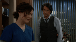 Elizabeth (Rebecca Herbst) had Finn (Michael Easton) look at Franco’s (Roger Howath) brain scan and asked his opinion whether Franco’s tumor was shrinking. Meanwhile, Franco continued to hear Peter’s (Wes Ramsey) voice in his head while dreaming. Sam (Kelly Monaco) told Curtis (Donnell Turner) he should support Jordan (Briana Henry). Portia (Brook Kerr) asked Jordan to give Cyrus Renault (Jeff Kober) what he was asking for Taggert’s sake. Martin (Michael E. Knight) ate fried chicken while he and Jackie (Kim Delaney) watched the facility in Vermont to see whether Bobbie Spencer (Jackie Zeman) was taking care of Florence. Nikolas (Marcus Coloma) paid the cop guarding Ryan’s (Jon Lindstrom) to leave and give him a few moments. Ava (Maura West) came into Ryan’s room and taunted him for being brought back to GH for bed sores. She said she got his gift but if he thought the roach scared him, guess again. Nikolas told Laura (Genie Francis) he and Ava were planning to marry late spring, early summer. Laura commented how that will give him time to make things right with Spencer. Nikolas said Spencer was being stubborn in accepting Ava. Jackie told Martin a nurse contact she interviewed once gave her the tip Florence was there. She assured even though she didn’t plan on calling the police, she was known as Jackie Templeton, a woman of action. Portia told Jordan she knows she’d do anything for her children like Portia would for Trina (Sydney Mikayla). Dr. Robinson told the police commissioner how Taggert was refusing to see his daughter. Finn told Elizabeth it was his professional opinion the size and shape of Franco’s tumor remained unchanged. Elizabeth admitted her anger at Franco for delaying telling her about the return of his tumor and going to Geneva and delaying treatment…how much time did he lose and allow the tumor time to grow? Franco almost punched Cameron (William Lipton) when the teen startled him from his nightmare. Cameron blamed the article about how dangerous Franco was because his tumor returned. Cameron vowed to defend his family. “Wrong room” Jason (Steve Burton) said when Jackie and Martin entered looking for Florence. Jackie asked Jason to let Martin see with his own eyes his mother was okay. Nikolas told Laura he would work to get Spencer to be a part of the wedding. Ava stomped on the roach telling Ryan that was how she deals with pests. Jordan suggested Portia tell Trina it was the police commissioner’s fault Taggert wasn’t seeing his daughter. Jordan said she’ll put in a request with the FBI for Taggert to be barred from having visitors. Tired of cases of cheating spouses, Curtis told Sam he was considering buying the club and asked whether she wanted to buy him out of his portion of the PI company. “Let the bargaining begin” Sam answered with a smile. Martin finally got to see his mother. She told Jackie how much she missed her son and added she wanted nothing to deal with her oldest son. Jackie pulled out her recorder for the story. Ava continued to taunt Ryan by spraying perfume in his face knowing he was allergic. After she left the room, the guard returned with Ryan’s mail and read a letter from his biggest fan: H. Webber. On top of the mail was an envelope from S. Cassadine.