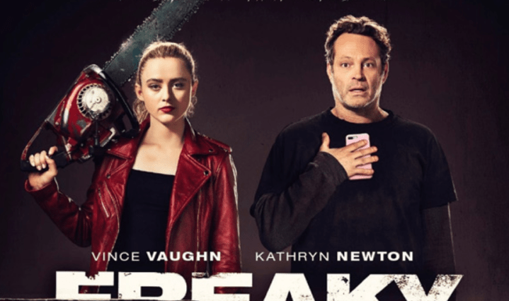 Freaky is a 2020 American supernatural slasher comedy film directed by Christopher Landon, from a screenplay by Landon and Michael Kennedy, and starring Vince Vaughn, Kathryn Newton, Katie Finneran, Celeste O’Connor, and Alan Ruck. The film tells the story of a high school student who unintentionally switches bodies with a serial killer. Jason Blum serves as a producer under his Blumhouse Productions banner (Wikipedia).