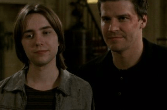 The character of Angel (played by David Boreanaz) first appeared in the Pilot episode of Buffy the Vampire Slayer. But it wasn’t until Episode 7 titled “Angel” when Buffy (and viewers) learned he was a vampire when the character emerged as a tortured hero. He had a past to atone for based on centuries of killings he committed as a blood thirsty vampire.